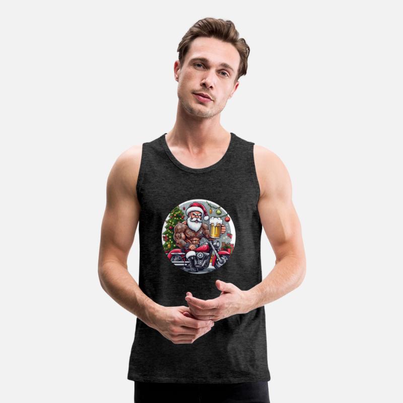 Tatooed Santa on a motorcycle with a beer